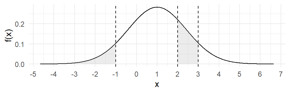 Fig. 2.2 displays the normal pdf with \(\mu = 1\) and \(\sigma^2 = 2\), with some regions shaded.