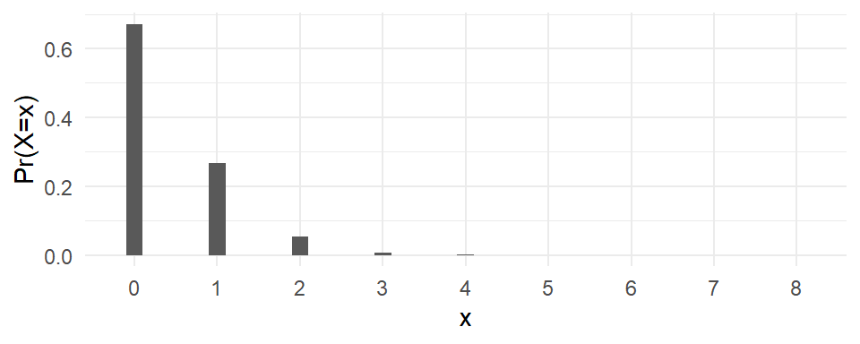 Example 2.4 The random variable \(X\) has the Poisson distribution with parameter \(\lambda>0\) if \[ f_X(x) = \Pr(X=x) = \frac{e^{-\lambda}\lambda^x}{x!}\,,\,\,x=0, 1, 2, \dots\,. \tag{2.3}\] We write \(X \sim \text{Poisson}(\lambda)\). Fig. 2.1 shows the Poisson probability distribution functions for \(\lambda=0.4\). This distribution might be a good description of the population of households in Example 2.2(b) where each bar in Fig. 2.1 represents the population proportion of households with \(x\) number of dogs.