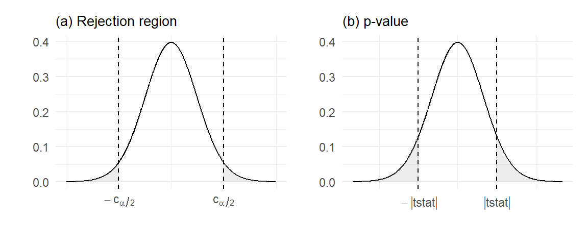 Result (2.24) is useful for hypotheses testing when one is unable or unwilling to make an assumption regarding the distribution of the population. Suppose \(\{X_i\}_{i=1}^n\) is an i.i.d. sample with \(E(X_i)=\mu\) and \(\mathit{Var}(X_i)=\sigma^2\). The sample mean \(\overline{X}_n\) is a consistent estimator for \(\mu\) and \(\widehat{\sigma^2}=\frac{1}{n-1}\sum_{i=1}^n (X_i-\overline{X}_n)^2\) is a consistent estimator for \(\sigma^2\). To test the null hypothesis \(H_0:\mu=\mu_0\), we need to compute the distribution of the sample mean, but you cannot do this unless you know the distribution of each \(X_i\). Result (2.24), however, tells us that if our sample size is large enough, then under the null hypothesis, \[ t = \frac{\overline{X}_n - \mu_0}{\sqrt{\widehat{\sigma^2}/n}} \overset{a}{\sim} \mathrm{Normal}(0,1). \tag{2.25}\] It suggests that we use the decision rule “reject the null if \(|t|>c_\alpha\)” where \(c_\alpha\) is that value such that \(\mathrm{Pr}(|t|>c_\alpha)=\alpha\), where \(\alpha\) is the chosen “level of significance” of the test, i.e., the probability of rejecting the null when it is true, and where the value \(c_\alpha\) is found from the standard normal distribution. For 0.01, 0.05, 0.10 levels of significance, the appropriate values of \(c_\alpha\) are approximately