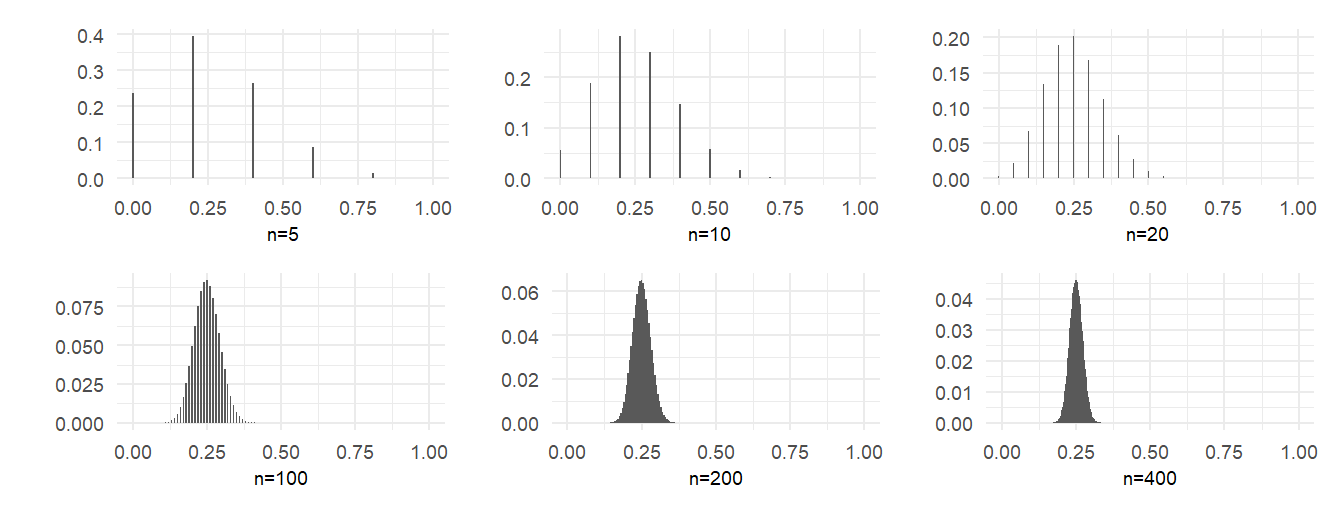 In Example 2.9 we derived the distribution of the sample mean in the coin toss example, and calculated this distribution for a fair coin with sample size 20. We repeat this exercise, this time for a coin with \(p=0.25\), for sample sizes of 5, 10, 20, 100, 200 and 400. We present the probability distribution functions graphically in Fig. 2.10. The convergence in probability of the sample mean to the true value of \(p\) can be seen in these graphs.