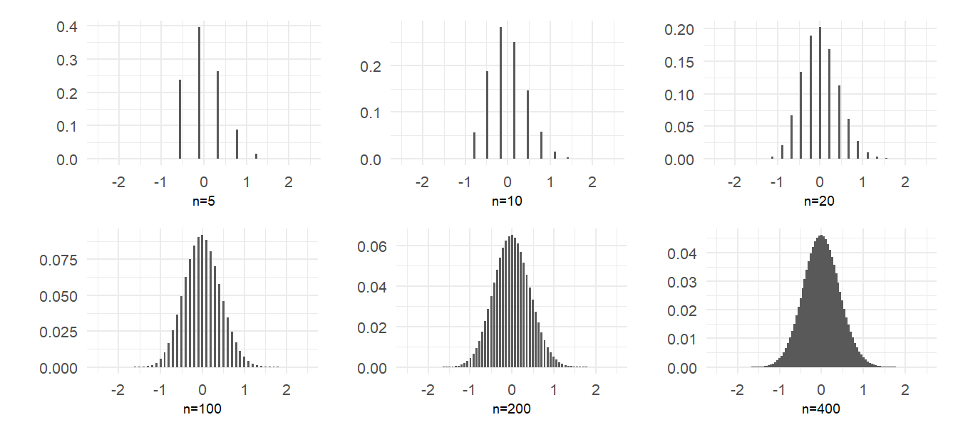 The distribution of the sample mean in the example above, with \(p=0.25\), is unsurprisingly skewed in small samples because of the low probability of heads relative to tails. However, the shape of the distribution appears to quickly becomes quite symmetric as sample size grows, and appears to converge to a familiar bell-shaped distribution. Of course, in the limit the distribution collapses to a degenerate one with all of the probability at \(p=0.25\). This is because the variance of the sample mean, \(\mathit{Var}(\hat{p})=p(1-p)/n\) goes to zero as \(n \rightarrow \infty\). Suppose, however, that we scale the sample mean (after subtracting \(p\)) by \(\sqrt{n}\), i.e., suppose we look at the distribution of \[ \sqrt{n}(\hat{p}-p). \tag{2.23}\] This random variable now has mean 0 and a non-collapsing variance \(np(1-p)/n=p(1-p)\). We can then talk about the shape of (2.23) as \(n \rightarrow \infty\) without the distribution collapsing to a single point. The plots in Fig. 2.11 show the same distributions as in Fig. 2.10, but after centering and scaling as in (2.23). The distributions appear to take the shape of a normal distribution as sample size increases.
