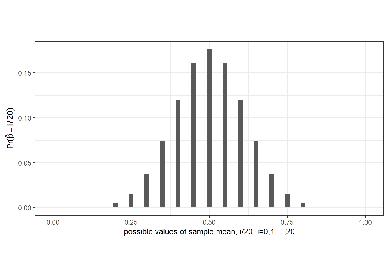 Since we are trying to estimate the population mean, it seems sensible to use the sample mean as the estimator for the population mean: \[ \hat{\mu} = \frac{1}{n}\sum_{i=1}^{n} X_{i} = \overline{X}\,. \tag{2.15}\] You should think of (2.15) as a random variable. Every time you draw \(n\) observations from the population, you will get a different sample, and therefore a different sample mean. Put briefly, since the \(X_i\)’s are random, then so is their average. Being a random variable, the sample mean will have an expected value, a variance, and a distribution.