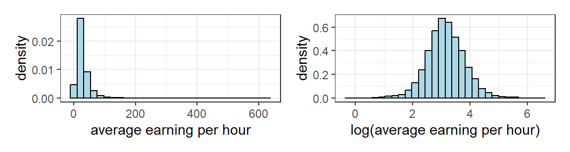 What are we getting? To make arguments simpler, we consider consistency instead of unbiasedness, and assume that \(earn \sim \text{Log-normal}(\mu, \sigma^2)\). Then we have \(E(\ln earn) = \mu\), and from the properties of the log-normal distribution, we have \[ E(earn) = \exp{\mu}\exp(\sigma^2/2) > \exp \mu = \mathit{Median}(earn) \] where the inequality arises because \(\exp(\sigma^2/2) > 1\). We know the sample mean of \(\ln earn_i\) is consistent for \(\mu\), i.e., \[ \frac{1}{n}\sum_{i=1}^n \ln earn_i \overset{p}\longrightarrow \mu\,, \] therefore the exponent of the sample mean of \(\ln earn_i\) is consistent for the the population median of \(earn\): \[ \exp\left( \frac{1}{n}\sum_{i=1}^n \ln earn_i \right) \overset{p}\longrightarrow \exp \mu\,. \] However, the exponent of the sample mean of \(\ln earn_i\) consistently underestimates the population mean of \(earn\).