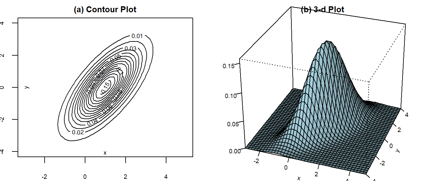 Contour plots are helpful for visualizing bivariate normal distributions. We show the contour plots of a bivariate normal distribution with \[ (\mu_x, \mu_y, \sigma_x^2, \sigma_y^2, \rho_{xy}) = (1, 0, 1, 2, 0.9). \] in Fig. 3.5(a). Alternatively, one can look at the 3D plot of the bivariate pdf in Fig. 3.5(b).