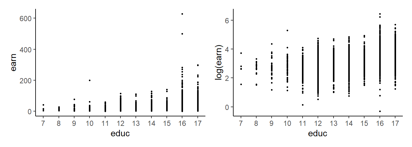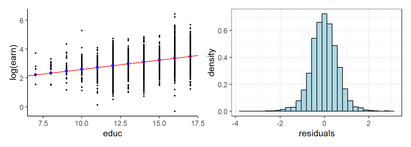cat(round(exp(mdl1$beta0hat + mdl1$beta1hat*12),2), "dollars (cond. median pred.).")Predicted ave. hr. earn for individual with 12 years educ is 17.39 dollars (cond. median pred.).