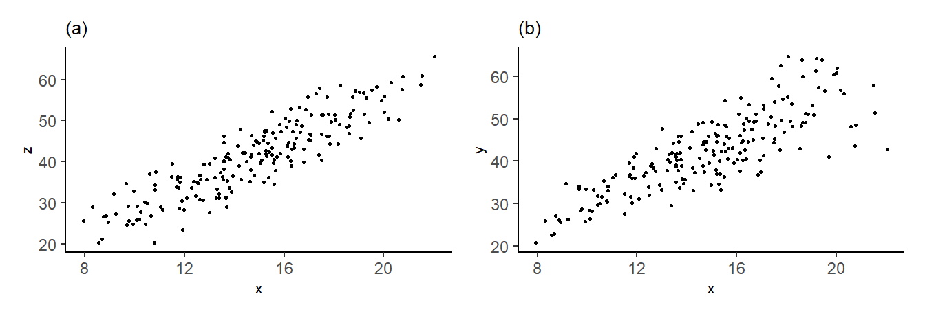 Here is another way of looking at this issue. Suppose we have \[ E(Y \mid X, Z) = \beta_0 + \beta_1 X + \beta_2 Z \] and define \(u = Y - \beta_0 - \beta_1X - \beta_2 Z\). Then we can write \[ Y = \beta_0 + \beta_1 X + \beta_2 Z + u\,,\,\,E(u \mid X, Z) = 0\,. \tag{3.41}\] Suppose \(X\) and \(Z\) are correlated. Then if we write \[ Y = \beta_0 + \beta_1 X + \epsilon \tag{3.42}\] where the \(\beta_0\) and \(\beta_1\) in (3.42) are the same as the \(\beta_0\) and \(\beta_1\) in (3.41), then \[ \epsilon = \beta_2 Z + u\,. \] If \(X\) and \(Z\) are correlated, then \(\epsilon\) and \(X\) must be correlated, so we no longer have \(E(\epsilon \mid X) = 0\). This causes the OLS estimator for \(\beta_1\) in the simple linear regression of \(Y\) on \(X\) to be biased for \(\beta_1\).