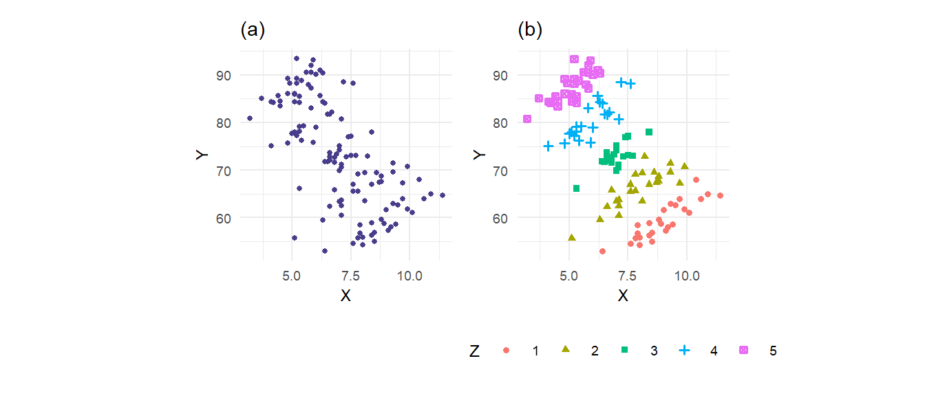 Example 3.3 The file multireg_eg.csv contains observations on variables \(X\), \(Y\) and \(Z\). The variable \(Z\) takes on integer values 1 to 5 only. Fig. 3.4(a) shows a scatterplot of \(Y\) against \(X\). Fig. 3.4(b) shows the same scatterplot, but this time the value of \(Z\) corresponding to each (\(X\),\(Y\)) pair is indicated.