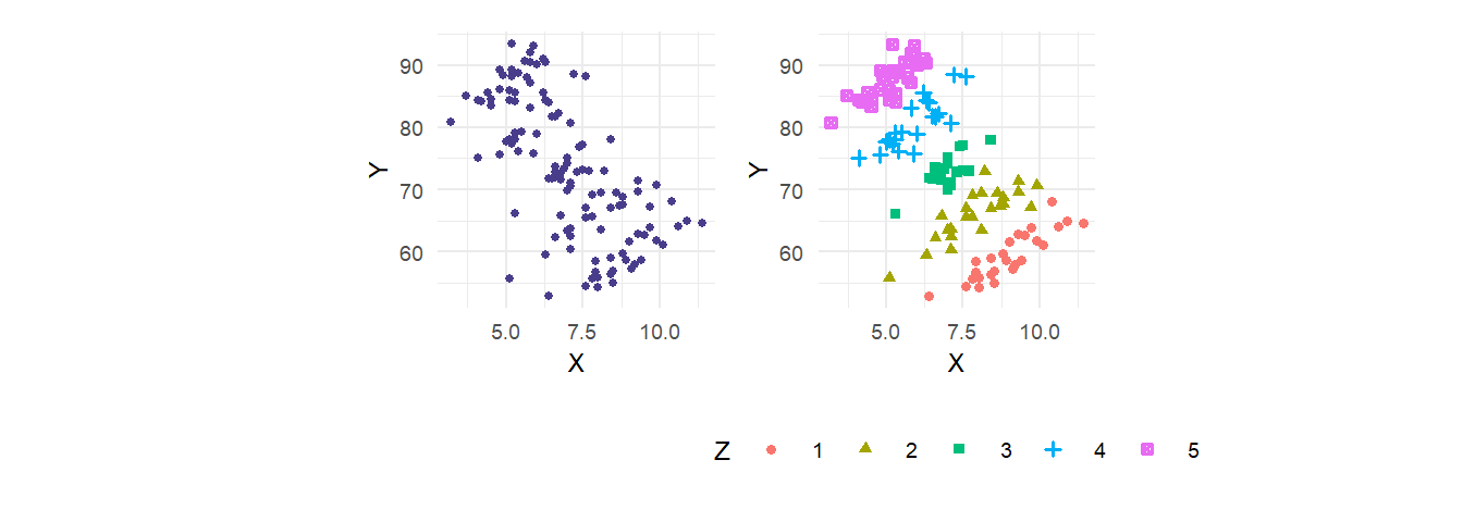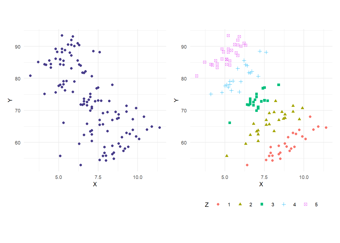 p2 <- ggplot(data=df) + geom_point(aes(x=X, y=Y, shape=as.factor(Z), color=as.factor(Z))) +
