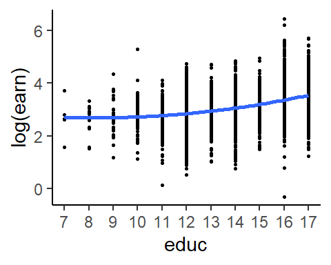 \] Regressing \(\ln earn\) on \(educ\) and \(educ^2\) does produce a more satisfying fit.