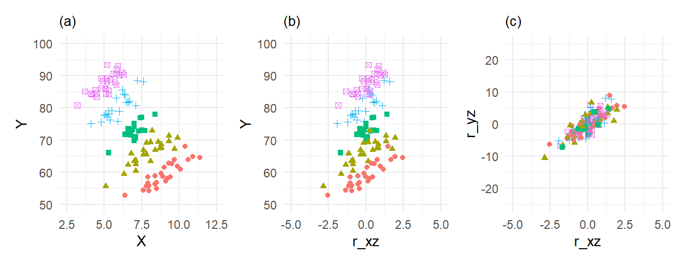 Regress \(Y_i\) on \(Z_i\), and collect the residuals \(r_{i,y \mid z}\) from this regression, i.e., compute \[ r_{i,y \mid z} = Y_i - \hat{\alpha}_0 - \hat{\alpha}_1Z_i \; , \; i=1,2,...,n \] where \(\hat{\alpha}_0\) and \(\hat{\alpha}_1\) are the OLS estimators for the intercept and slope coefficients from a regression of \(Y_i\) on a constant and \(Z_i\). As in the first regression, the residuals \(r_{i,y \mid z}\) contain the movements in \(Y_i\) after filtering out that part of \(Y_i\) that is correlated with \(Z_i\).