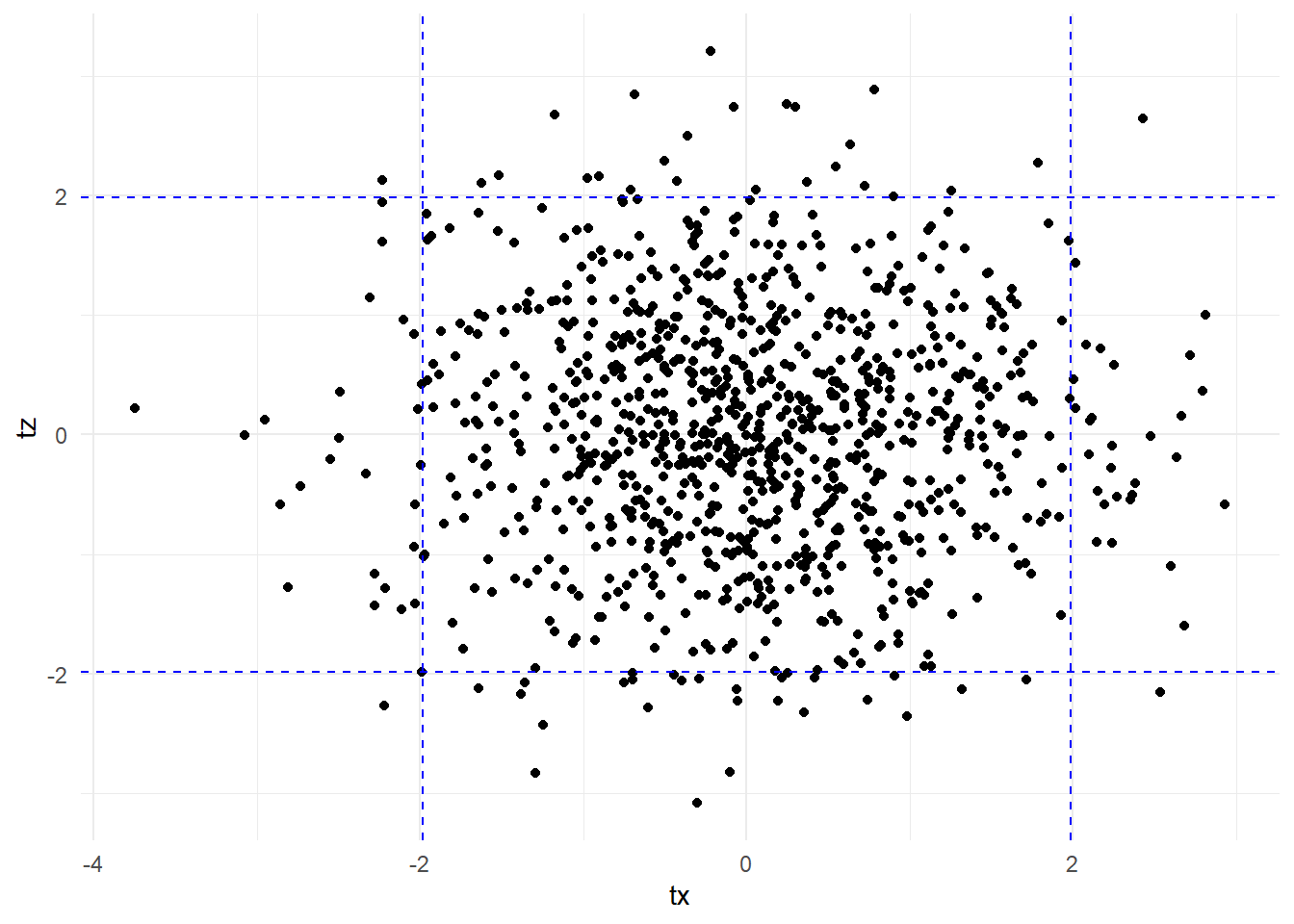 We plot the t-stats below, indicating the critical values for the individual tests. The proportion of points above the upper horizontal line or below the lower one is about 0.05. Similarly, the proportion of points to the left of the left vertical line or to the right of the right one is roughly 0.05. The number of point that meet either of the two sets of criteria is much larger, roughly the sum of the two proportions.