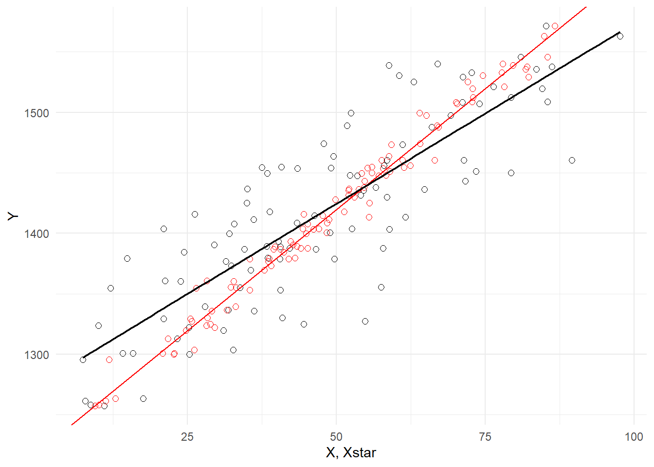 Another kind of sampling issue is measurement error. Suppose \(Y = \beta_0 + \beta_1 X + \epsilon\) describes the relationship between \(Y\) and \(X\), but \(X\) is only observed with error, i.e., you observe \(X^{*} = X + u\). Assume that the measurement error \(u\) is independent of \(X\). Then \[ \begin{aligned} Y &= \beta_0 + \beta_1 X + \epsilon \\ &= \beta_0 + \beta_1 (X^* - u) + \epsilon \\ &= \beta_0 + \beta_1 X^* + (\epsilon - \beta_1u) \\ &= \beta_0 + \beta_1 X^* + v \end{aligned} \] where \(v = \epsilon - \beta_1 u\). You proceed with what appears to be the only feasible option to you, which is to run the regression \[ Y = \beta_0 + \beta_1 X^* + v\,, \] but since \(u\) is correlated with \(X^*\), the assumption \(E[v|X^*]=0\) does not hold. In the simulated example below, we have a positively sloped PRF, shown in red, and measurement error in the regressor. Since \(\beta_1\) is positive, \(X^*\) and \(v\) are negatively correlated, meaning that the error term \(v\) will tend to be positive for smaller \(X*\) and negative for larger \(X*\). This tendency is visible in Fig. 7.4 below. The red circles are the sample you would have observed with no measurement error. The black circles are the same sample points, but with measurement error in the \(X_{i}\)’s.
