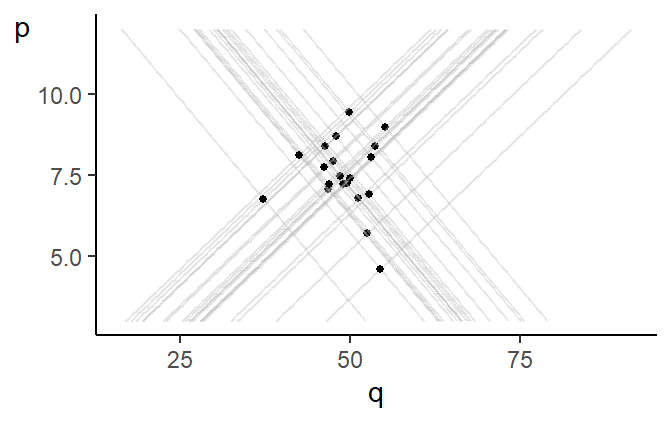 Fig. 7.5 illustrates this issue. We simulate the demand and supply example with a series of random demand and supply shocks. Each demand shock shifts the demand curve and each supply shock shifts the supply curve resulting in a new intersection point. The set of equilibrium prices and quantity does not reflect either the demand or the supply function.